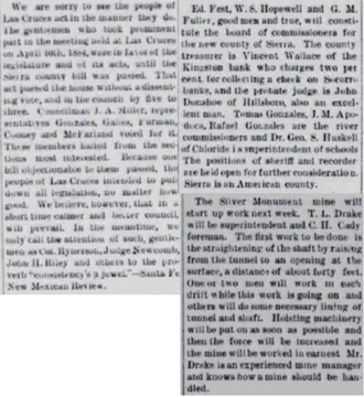 The first entry on page two falls within the category of “my how things change”: “The Las Cruces people complain that Dona Ana county, without Lake Valley, is the feeblest county financially in New Mexico. They also aver that Sierra County is one of the wealthiest.” Certainly a lesson in the “benefits” of extractive industries. The formation of the new county and the selection of Hillsboro as the county seat was not without controversy - see clips to the right and quotes below.