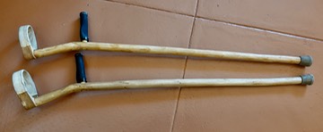 A couple of weekends ago, Bob Shipley stopped by the house to show us his new crutches. He had designed and made the forearm (aka elbow or Lofstrand) crutches from yucca, using other materials only as described below.